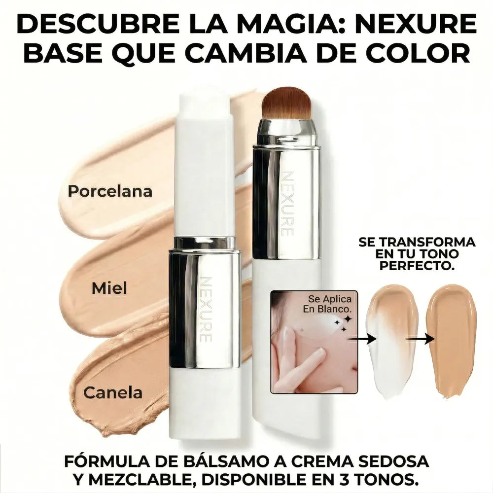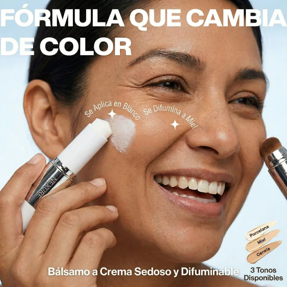 Sí, totalmente normal. Ese es el mecanismo. El bálsamo blanco contiene pigmentos encapsulados que se activan con el calor de tu piel al difuminar. En 10-15 segundos ya es tu tono exacto. Si sigue blanca, aplica más presión circular con el pincel.